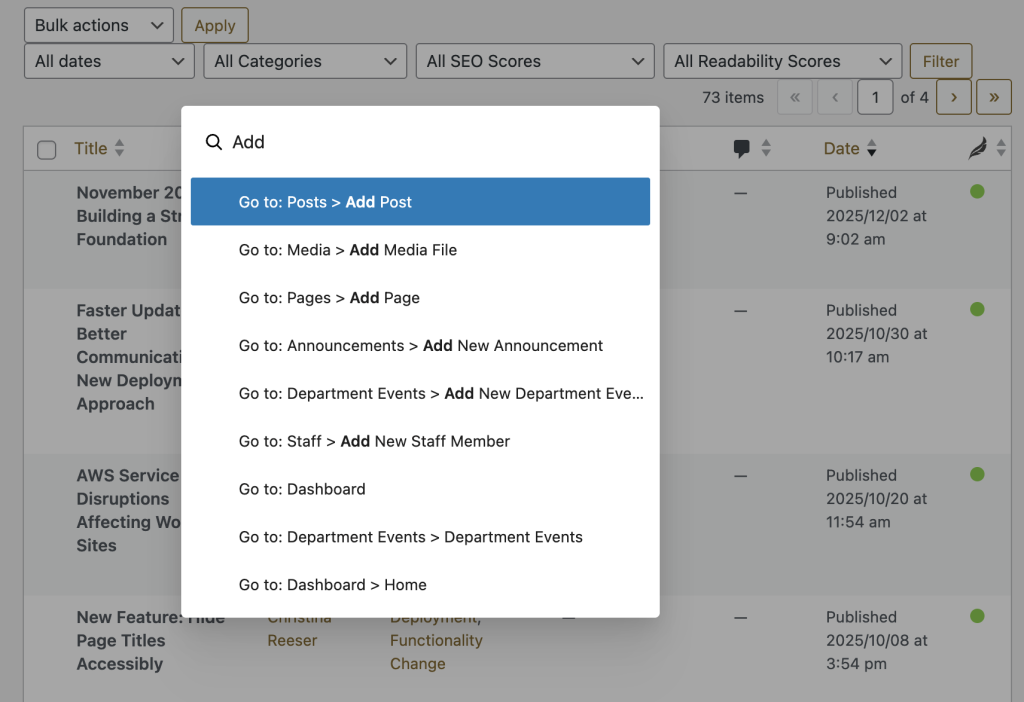 Accessibility was a key factor in the timing of this upgrade. We intentionally skipped WordPress 6.8 due to an editor change that caused significant usability issues for screen reader users. Those issues were addressed in WordPress 6.9, allowing us to move forward with confidence.