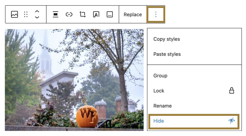 You can now temporarily hide any block without deleting it. This makes it easier to prepare seasonal content, stage updates, or switch between content variations without visitors seeing changes until you’re ready. As with Notes, the Show/Hide toggle is located in the block’s Options menu.