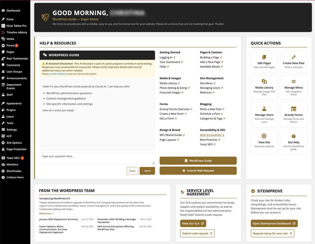 We’re excited to introduce a new AI chatbot inside the WordPress dashboard to help answer your questions about using the Wake Forest WordPress system. This assistant pulls information directly from our WordPress Guide, ensuring responses align with our approved themes, blocks and best practices. You’ll see it on the main dashboard page when you log in to WordPress, as part of a refreshed dashboard experience designed to make common tasks and resources easier to access.