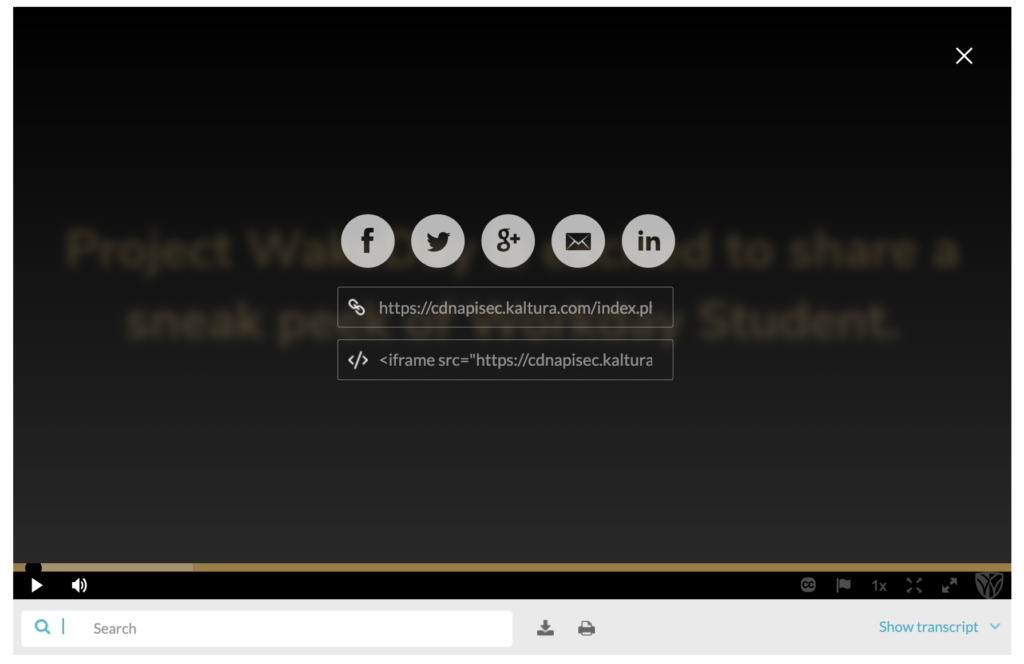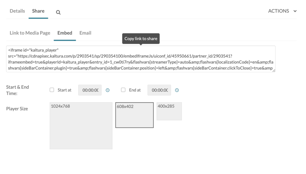 To get the correct video embed code, scroll down the Kaltura page to the Details section. Click Share and Embed and use the iframe code that appears in the text box. One copied, this code can then be placed in a shortcode and added to the page.