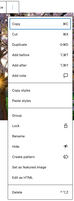 - Add before/after: Allows you to insert a new block above or below the currently selected block.
