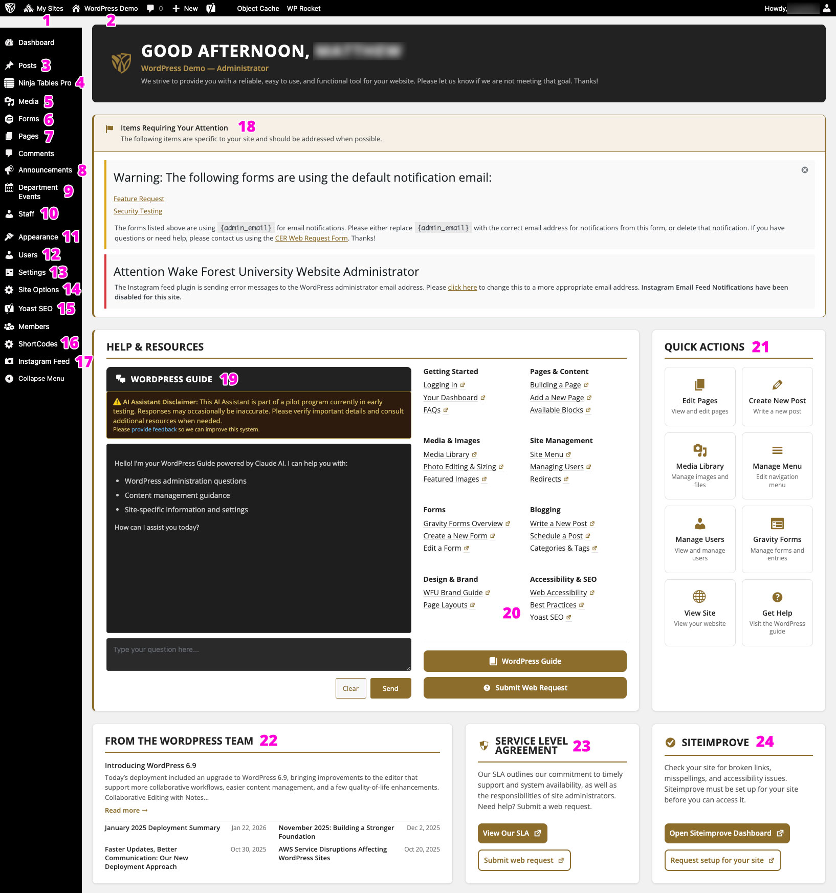 Once logged in you’ll have access to the WordPress Dashboard. Below, key areas of the Dashboard are identified.