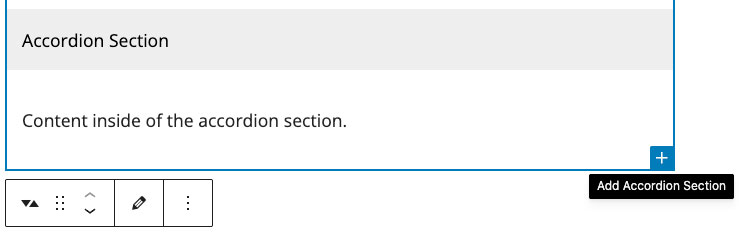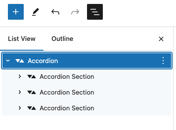 The easiest way to add another Accordion Section to your Accordion Block is to click the Document Overview icon (with the three horizontal lines in the top left of your editing interface) and select the parent Accordion from the List View.